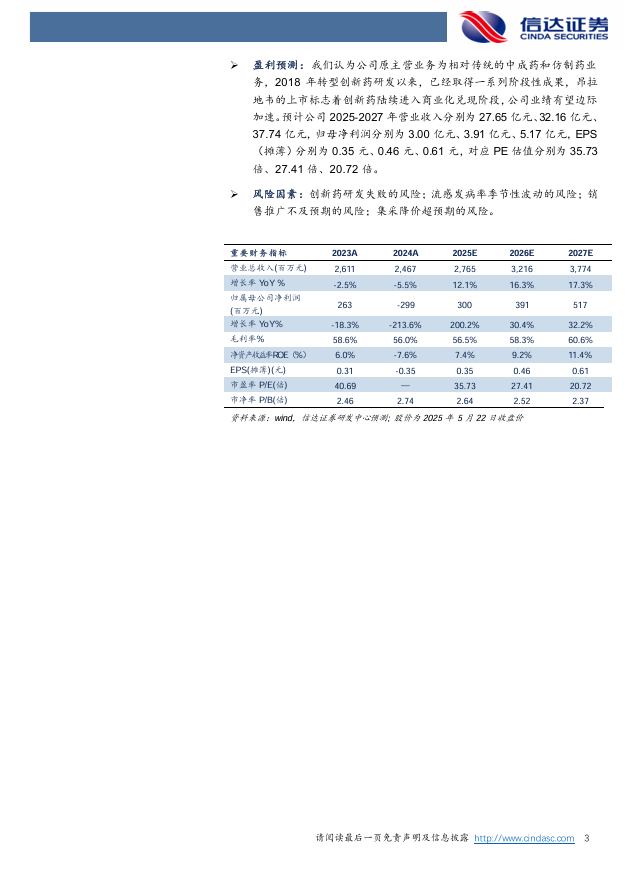 我们认为公司原主营业务为相对传统的中成药和仿制药业务,2018年转型创新药研发以来,已经取得一系列阶段性成果,昂拉地韦的上市标志着创新药陆续进入商业化兑现阶段,公司业绩有望边际加速。预计公司2025-2027年营业收入分别为27.65亿元、32.16亿元、37.74亿元,归母净利润分别为3.00亿元、3.91亿元、5.17亿元,EPS(摊薄)分别为0.35元、0.46元、0.61元,对应PE估值分别为35.73倍、27.41倍、20.72倍。