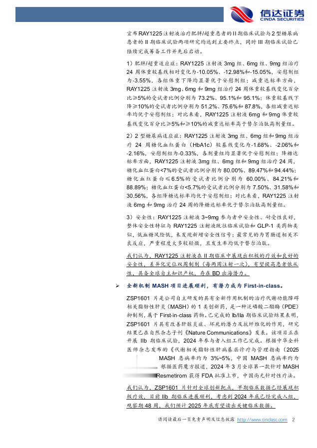 RAY1225注射液是公司研发、具有全球自主知识产权的创新结构多肽药物,具有GLP-1受体和GIP受体双重激动活性,得益于优异的药代动力学特性,具备每两周注射一次的长效药物潜力。2025年5月公司宣布RAY1225注射液治疗肥胖/超重患者的II期临床试验与2型糖尿病患者的II期临床试验两项研究均达到主要终点,同时III期临床试验已陆续完成筹备工作并先后启动。